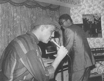 | Dolby and Herbie Hancock jam at Fairlight's party at a recent NAB convention in Las Vegas. Dolby is improvising with a Voicetracker. |